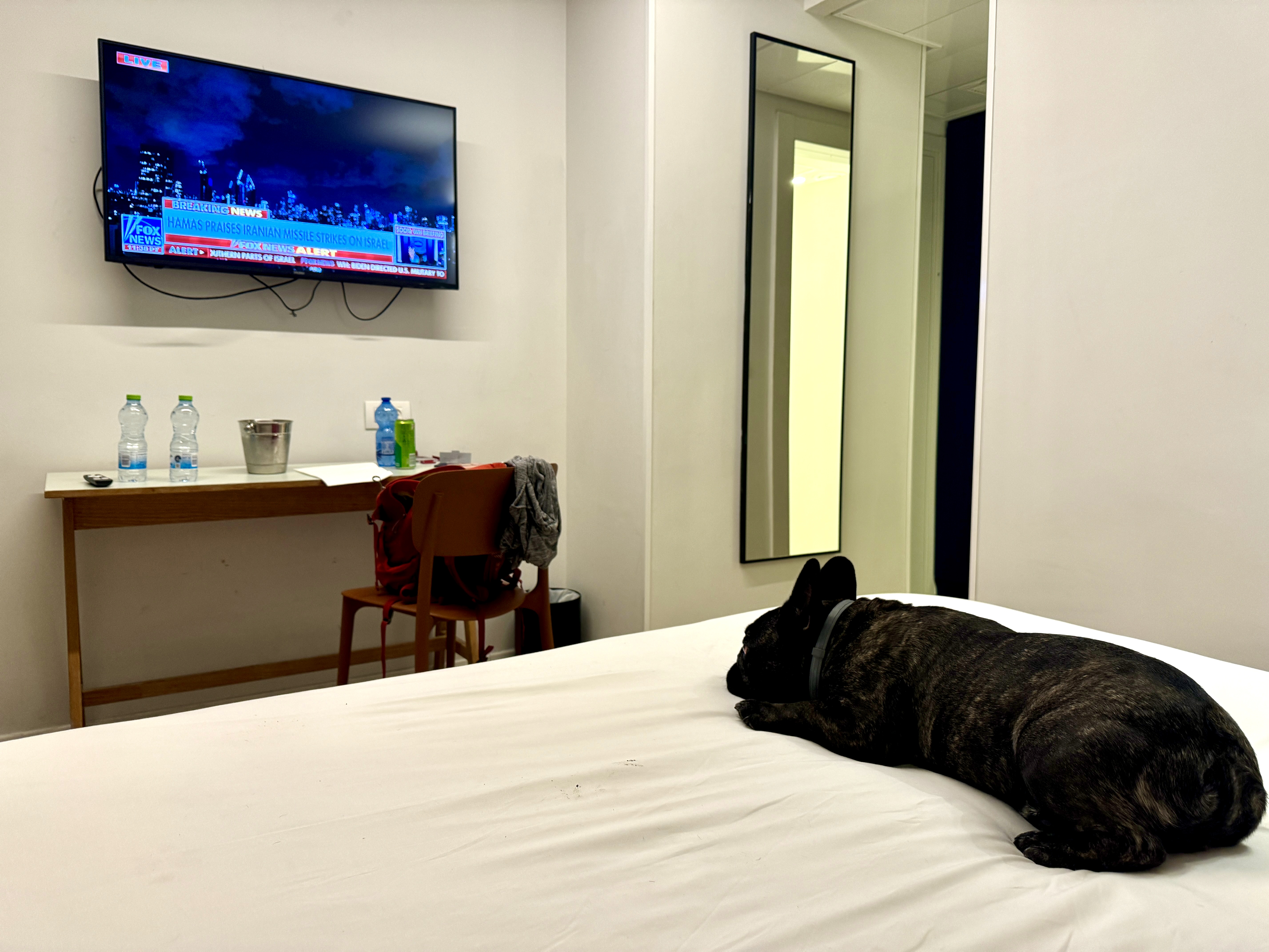 The drive was event free. But once home, I was immediately bombarded with headlines of imminent Iran missiles NOW! No wait, YESTERDAY! Get thee close to a shelter, not in one, and … well, just wait. This warning came from a rather unusual SMS from the Israeli government, supposedly the first of its kind successfully transmitted to all 8 million citizens. So I crammed more crap into my go bag — a bar of Ritter Sport chocolate, coffee flavored, rawhide treats for doggo, water bottles, then proceeded down to the square to sit next the underground parking lot, which housed an enormous sprawl of a shelter two levels deep. Legend has it every one of these municipal shelters comes stocked with water and supplies and WC stalls. Twenty minutes go by and I’m thinking, no one is milling around like me, no whiff of panic in the air, what am I doing obeying the alarm about an alarm. Thus, doggo and I hauled our asses back up to the apartment to wait. But yeah, not even 20 minutes later, the real siren blasted in the air and the Red Alert on my phone blew up, and I screamed to my dog, Let’s gooooo.